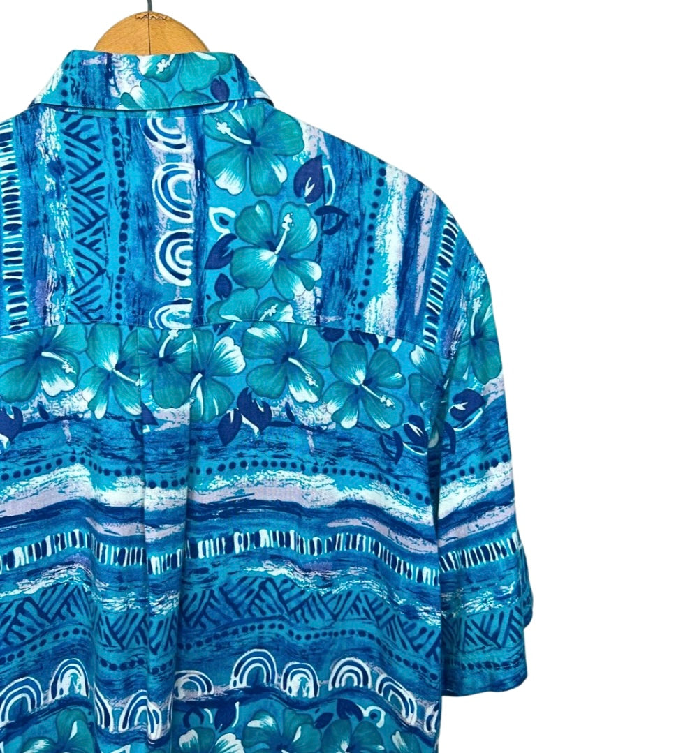 90’s Blue Hawaiian Hibiscus Print Short Sleeve Buttondown
